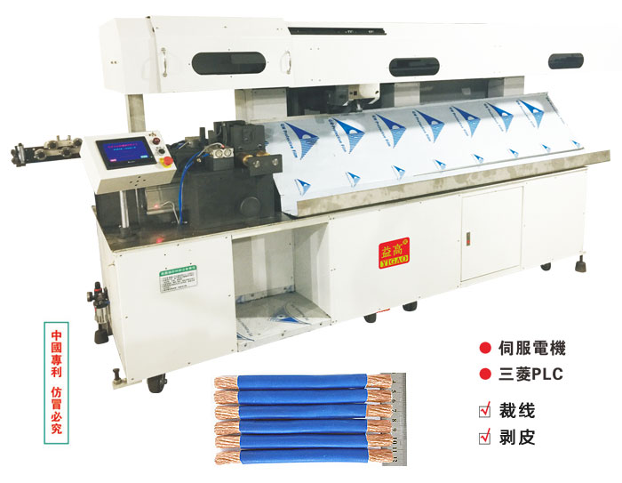 特點說明 本機使用日本三菱 PLC 及人機介面觸摸屏,采用日本安川YASK伺服馬達,日本 SMC 氣缸,德國FESTO電磁閥,日本歐姆龍OMRON感應器,日本THK 直線導軌等等。 采用了與常規裁線機不一樣的剝線方式,充分利用了刀架運動的原理,作為剝皮的動作,能輕松解決了如AWG0、AWG1、AWG2的粗線纜之類的裁剝問題,是線材加工史上的一次工業革命。 能精確裁剝且不損傷內芯線,速度快、剝頭整齊規范。 D為后粗線纜。