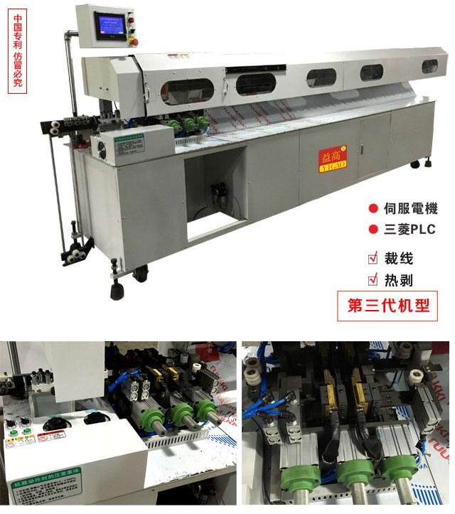 本機使用日本三菱 PLC 及人機介面觸摸屏,采用日本安川YASK伺服馬達,日本 SMC 氣缸,德國FESTO電磁閥,日本歐姆龍OMRON感應器,日本THK 直線導軌。 熱剝式高速電腦裁線剝皮機通過變壓器作用,利用低電壓大電流方式加熱,變成熱裁熱剝的工作模式,瞬間升溫、潔凈、環保、恒溫、實用。輕松解決了內含合成纖維(凱芙拉、黃旦絲、防彈絲、防斷絲)等扁平線、耳機線、蘋果手機數據線及特殊線材的裁剝問題,避免了切不斷、刮傷、芯線散開及不能半剝皮的問題。 R為熱剝式。