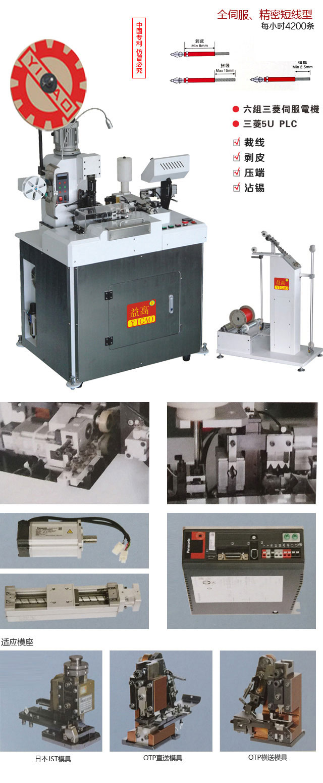 | 功能 | Function | 電線切斷、單端剝皮、雙端剝皮、單端壓著、單端扭線、單端沾錫、單端半剝 Wire cutting, single-end stripping, double-end stripping, single-end pressing, single-end twisting, single-end wetting, and single-end half-stripping |